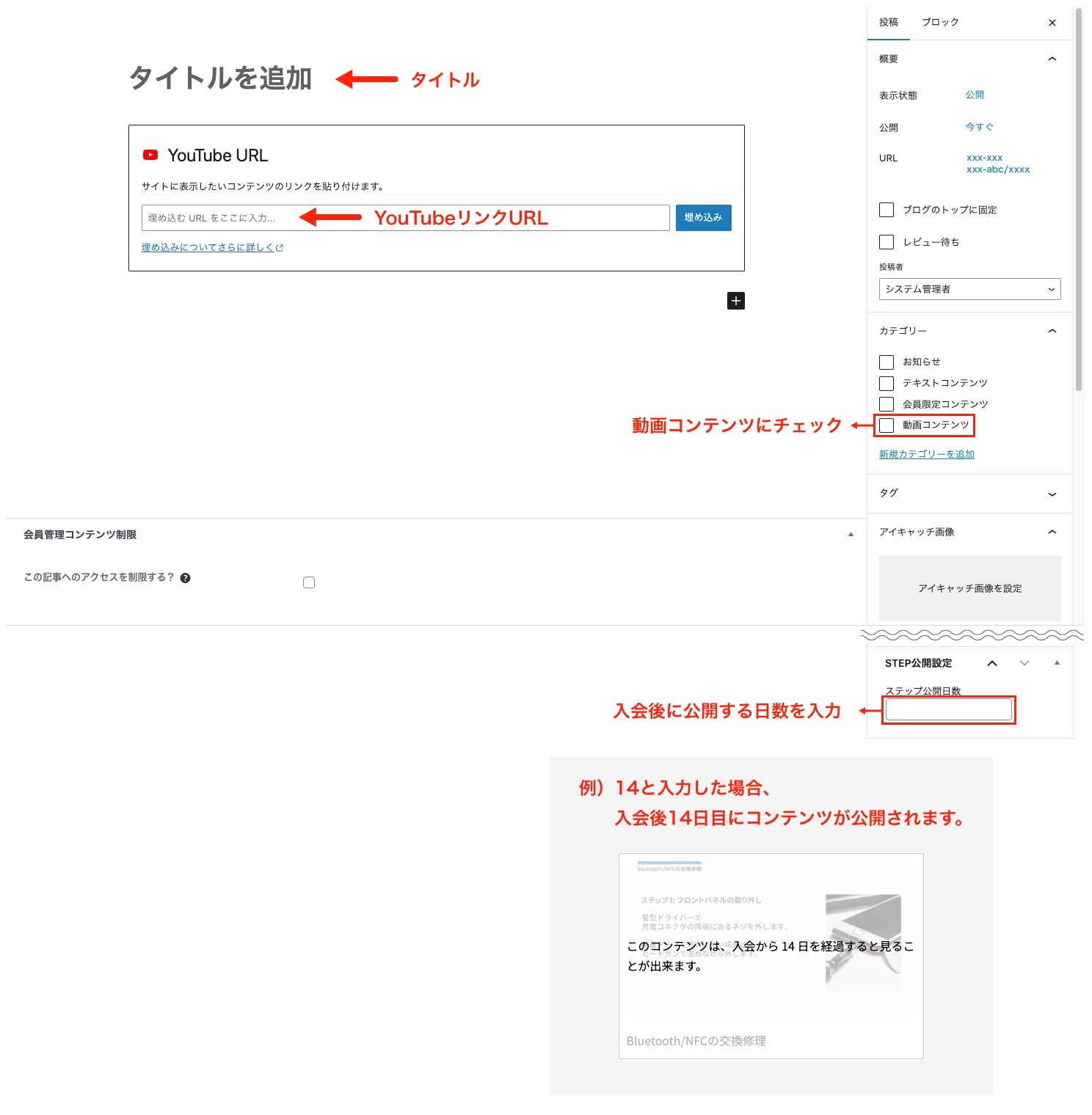 コンテンツを会員個別に段階的に公開するステップ公開機能が搭載されています。コンテンツを段階的に分け、各ステップにどのようなコンテンツを表示するか設定できます。
